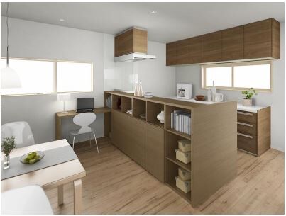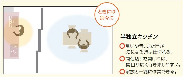 独立キッチンとオープンキッチンのいいとこ取りの「半独立キッチン」 がオススメです。間仕切*を開ければ、間口が広く行き来しやすく、2人一緒でも作業しやすいキッチンになります。ゆとりあるスペースを確保することで、車いすでの移動もスムーズに、永く使えるキッチンになりますよ。