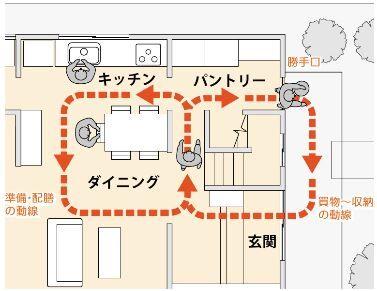 キッチンレイアウトのUDポイントは、「スムーズな動線!」です。調理~配膳~食事~片付けの動線がスムーズになるよう工夫しましょう。