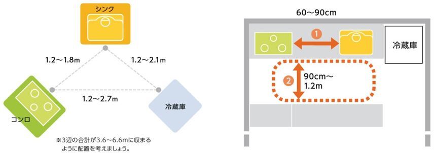 冷蔵庫・コンロ・シンクを結ぶ三角形の動線を「ワークトライアングル」といいます。三辺のバランスがよく、正三角形に近いほど疲れにくく、作業しやすいと言われています。また、作業スペース(右下:図①)は80cm前後、キッチンまわりの動作スペース(右下:図②)は90㎝~1.2mを確保できると動線がスムーズになります。