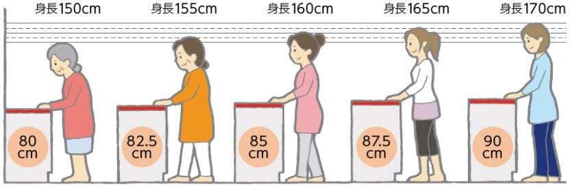 ラクな姿勢で作業できる適切なカウンターの高さは人それぞれです。最適なキッチンの高さは、身長÷ 2 + 5 cm が目安となります。作業時間が長いキッチンだからこそ、使い勝手がよく身体に合うものを選びましょう。