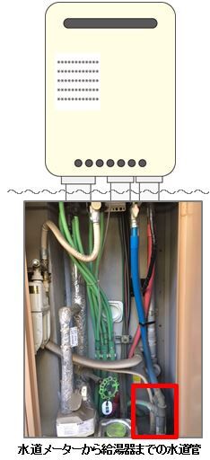 我が家の場合、PS扉内に設置した給湯器に接続された給水管(青)と給湯管(赤)の元の部分を保護してあげると凍結対策になるようです。入居して10年、初めてPS扉内の設備を知ることに。。