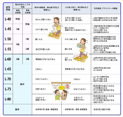 マンションで特に注意しておかなければならないのが、軽量床衝撃音遮断性能(LL)です。日本建築学会における適用等級と対応するL等級を見ると、LL-55以下を防音床材とし、さらにLL-45以下が望ましいと考えられています。