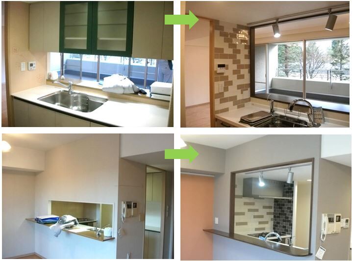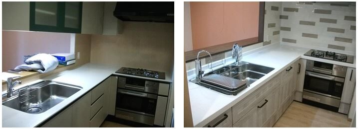 流し台の上にあった吊戸棚を撤去し、リビングへ続く開口部を拡張しました。マンションと隣接する公園の木々が見渡せる開放的なキッチンに変身しました。天井に新設した間接照明が作業手元を明るく照らします。開口部が大きくなり、リビングにいるご主人とコミュニケーションをとりながら、調理ができますね♪