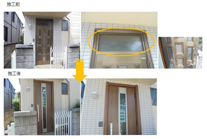 お客様のご要望:古くなった玄関ドアを替え、自然の光が入る明るい玄関にしたい。